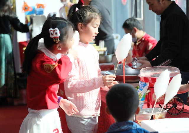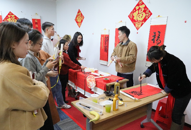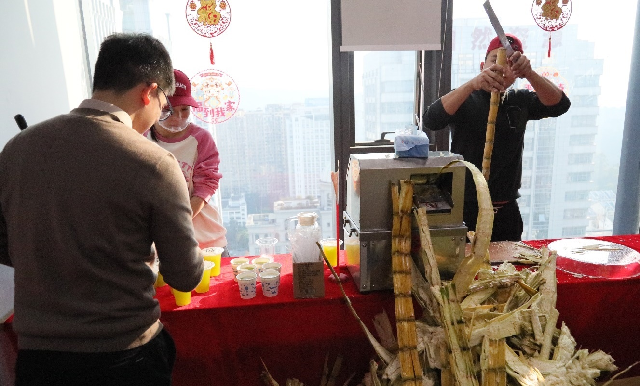 在各業(yè)務(wù)系統(tǒng)員工和高層領(lǐng)導(dǎo)合影留念之后,迎新春主場活動正式開啟了。本次活動將傳統(tǒng)文化與現(xiàn)代企業(yè)關(guān)懷相結(jié)合,內(nèi)容豐富多彩,別開生面,采用類似民俗逛廟會的形式,在活動現(xiàn)場分別設(shè)置了食品展示品嘗區(qū)域 、榨甘蔗汁、糖畫、糖葫蘆&棉花糖、游園、書寫春聯(lián)、DIY&繪彩擺件等模塊和項(xiàng)目,愜意的氛圍讓員工同事們放下日常繁忙的工作,以輕松愉悅的心態(tài)投入到各自喜歡和感興趣的迎新春活動中去,一起體驗(yàn)濃濃年味,享受生活的甜蜜味道!其中榨甘蔗汁、糖畫、糖葫蘆&棉花糖等很具糖業(yè)特色,特別是榨甘蔗汁令大家感到格外親切,仿佛置身微型的壓榨車間,一杯甘甜爽口的蔗汁則讓人體味到了生活的甜蜜;現(xiàn)場書寫春聯(lián)、新年掛歷贈送活動氣氛熱烈、翰墨飄香,深受大家歡迎,員工們領(lǐng)略到了書法藝術(shù)的魅力。前來領(lǐng)取春聯(lián)和掛歷的員工絡(luò)繹不絕,書法家現(xiàn)場揮毫潑墨,隨著筆鋒的起承轉(zhuǎn)合,一幅幅飽含祝福的春聯(lián)和掛歷便躍然紙上,為即將到來的新春佳節(jié)增添了濃厚的喜慶氛圍。一位員工拿著領(lǐng)到的掛歷高興地說:“這么好看的掛歷貼到家里,感覺年味更足了!以前都是買春聯(lián)和掛歷,今年公司請書法家現(xiàn)場書寫免費(fèi)送給我們,既溫馨又接地氣,讓我感受到了公司滿滿的關(guān)懷和愛意!”
